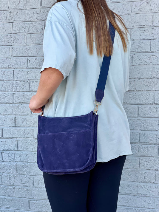Faux Suede Crossbody Bag w/ Canvas Strap in Navy